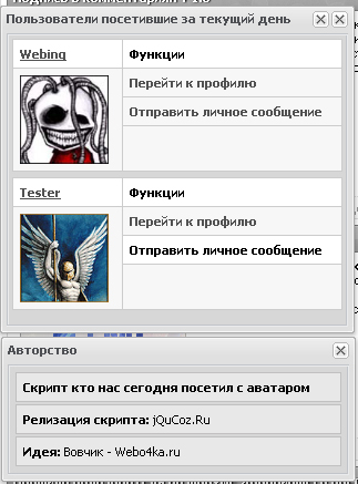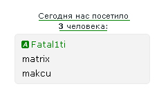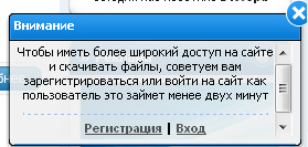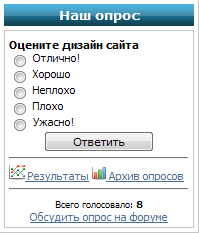 ![]() Устанавливаете в любое место вашего сайта. ![]() ![]() ![]() Преимущество скрипта: + 20% зарегистрированных юзеров на вашем сайте. w:265 - Ширина h:112 - Высота tm:20000 - время через которое окно само закроется (1000 = 1сек.) В любое место можно в блок: ![]() ![]() ![]() ![]() Установка: Код в форме опросов заменить на вот такой вот: ![]() А под количеством выводятся имена этих пользователей Установка: 1) Заходим в Панель Управления » Информеры » Создать Информер Вот ссылка адрес_вашего_сайта/panel/?a=informers Параметры информера: Название информера - любое; Раздел - пользователи посетившие сайт за текущий день Создать Открываем дизайн информера, и заменяем всё на этот код: |